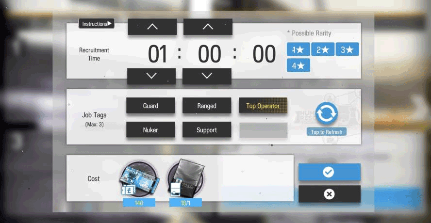 The free gacha type, recruitment, uses recruitment tickets that are obtained extremely easily through regular gameplay. Recruitment tickets take time (set by the player) to complete, or tickets (also obtained extremely easily) can be used to finish recruitment instantly. The rates are heavily skewed towards 3 and 4 stars but can rarely give 5 and even 6 star characters. This substantially speeds up progression in early game by allowing you to fill out your team pretty fast.